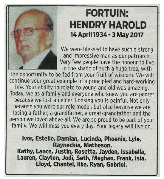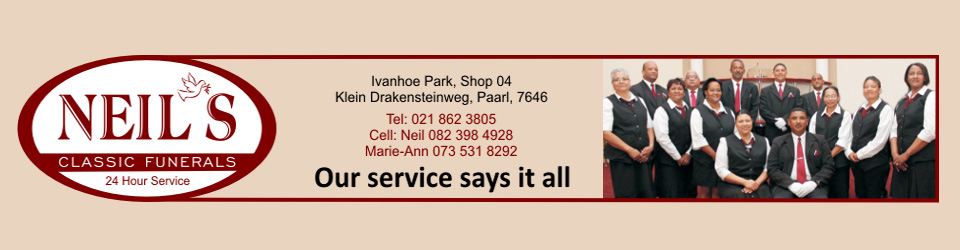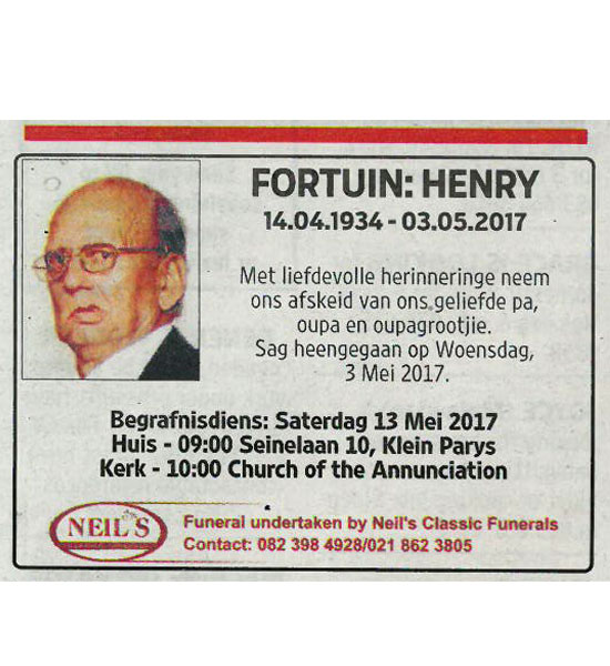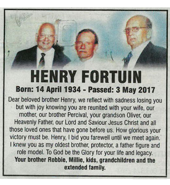 The management and staff of Neils Classic Funerals want to use this opportunity to convey our sincere and deepest condolences to the Fortuin and extended families.